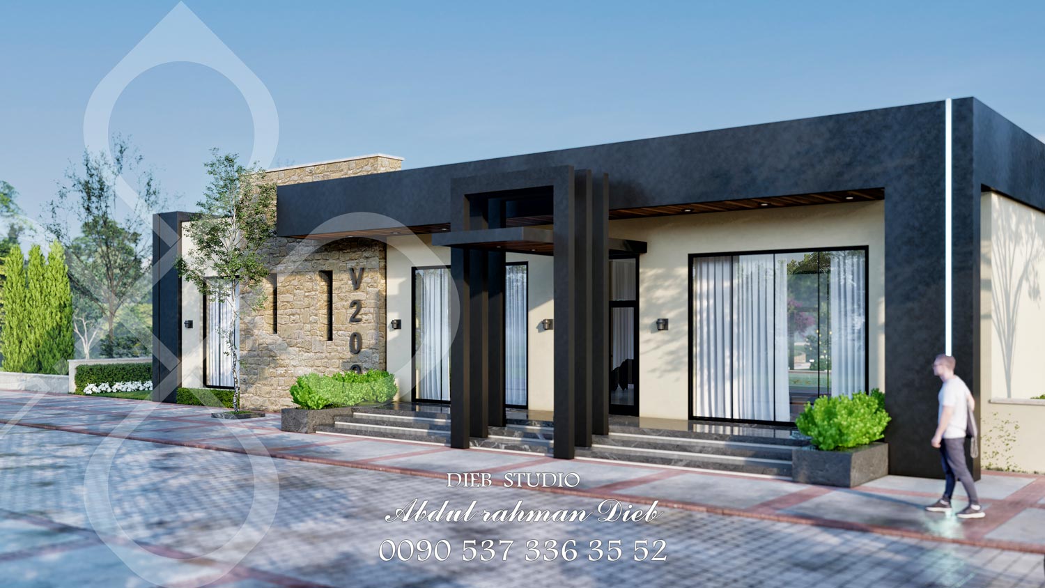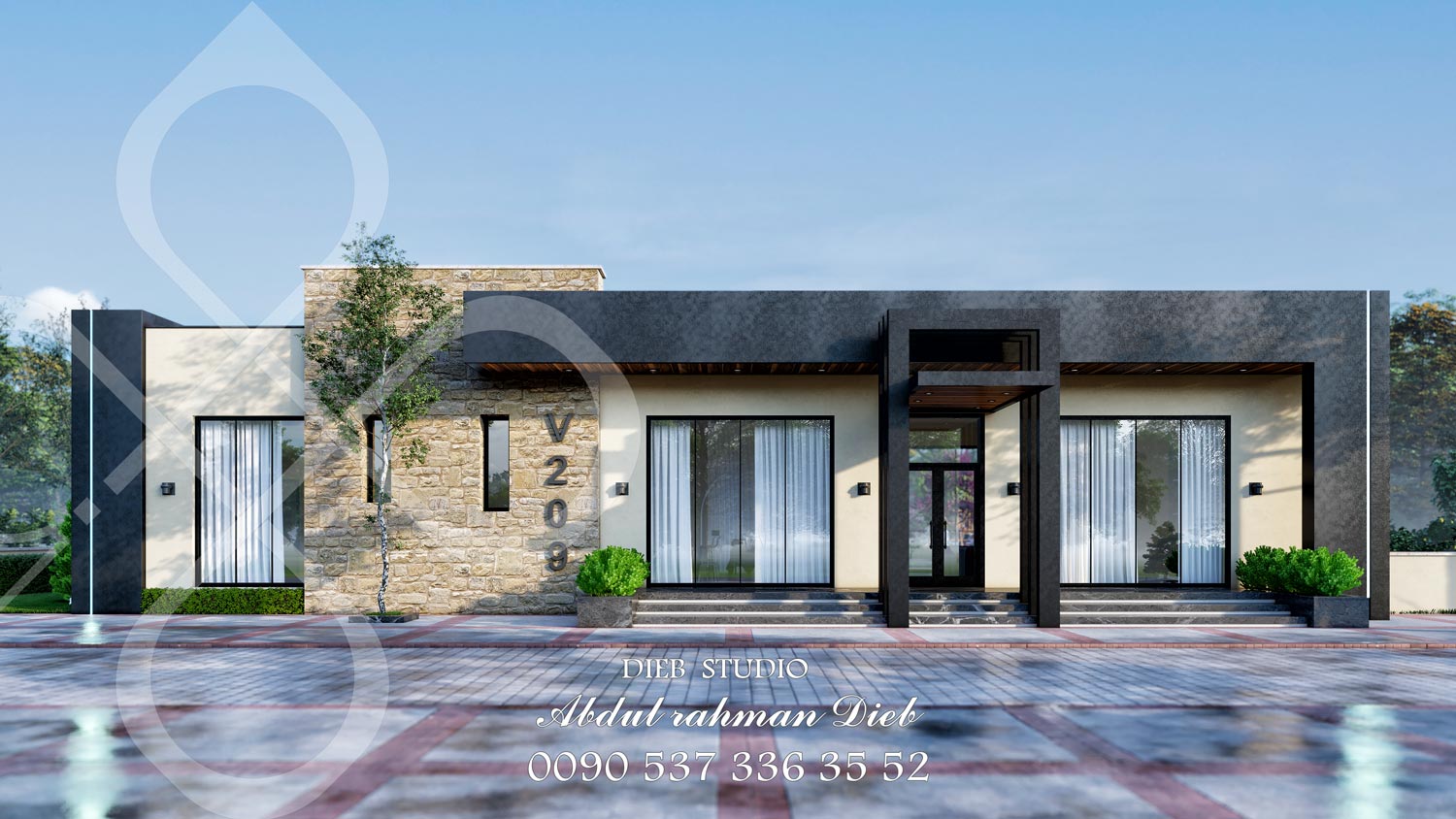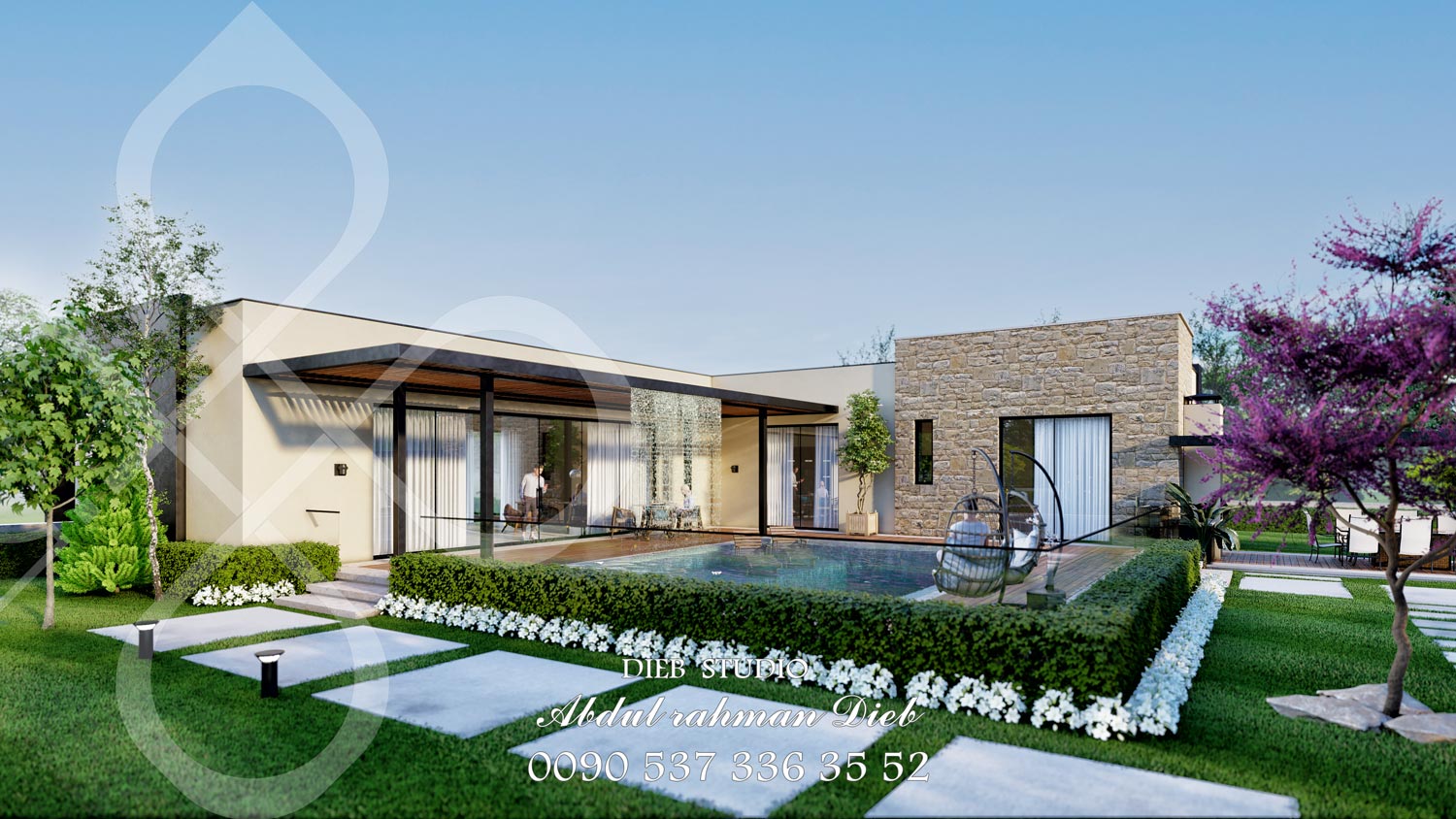 Modern one-story villa with a contemporary design and warm lighting. Experience a luxurious and sophisticated living space.