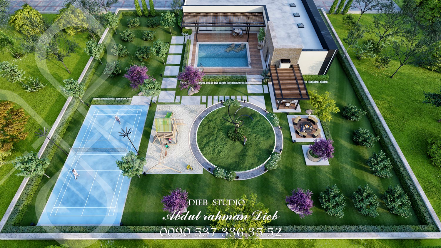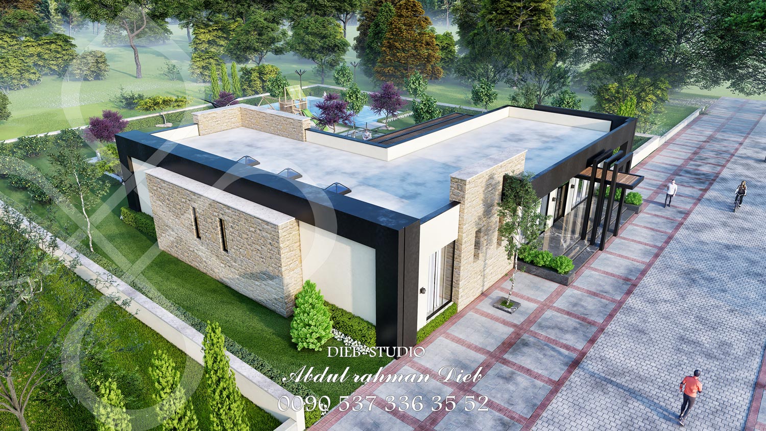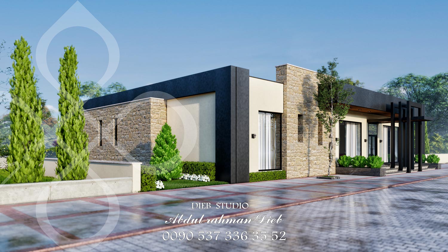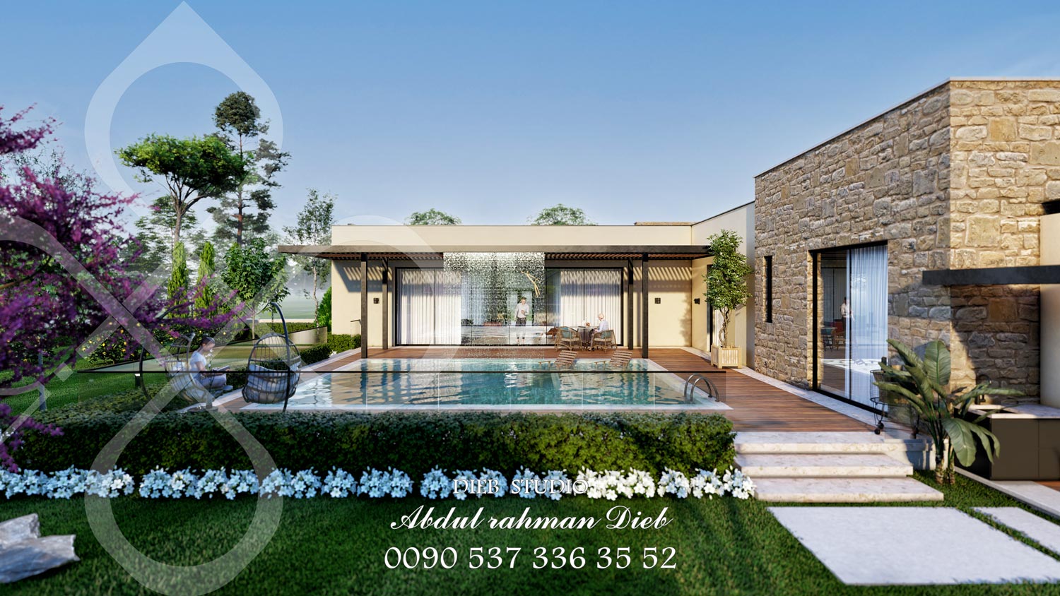 Modern one-story villa with a contemporary design and warm lighting. Experience a luxurious and sophisticated living space.